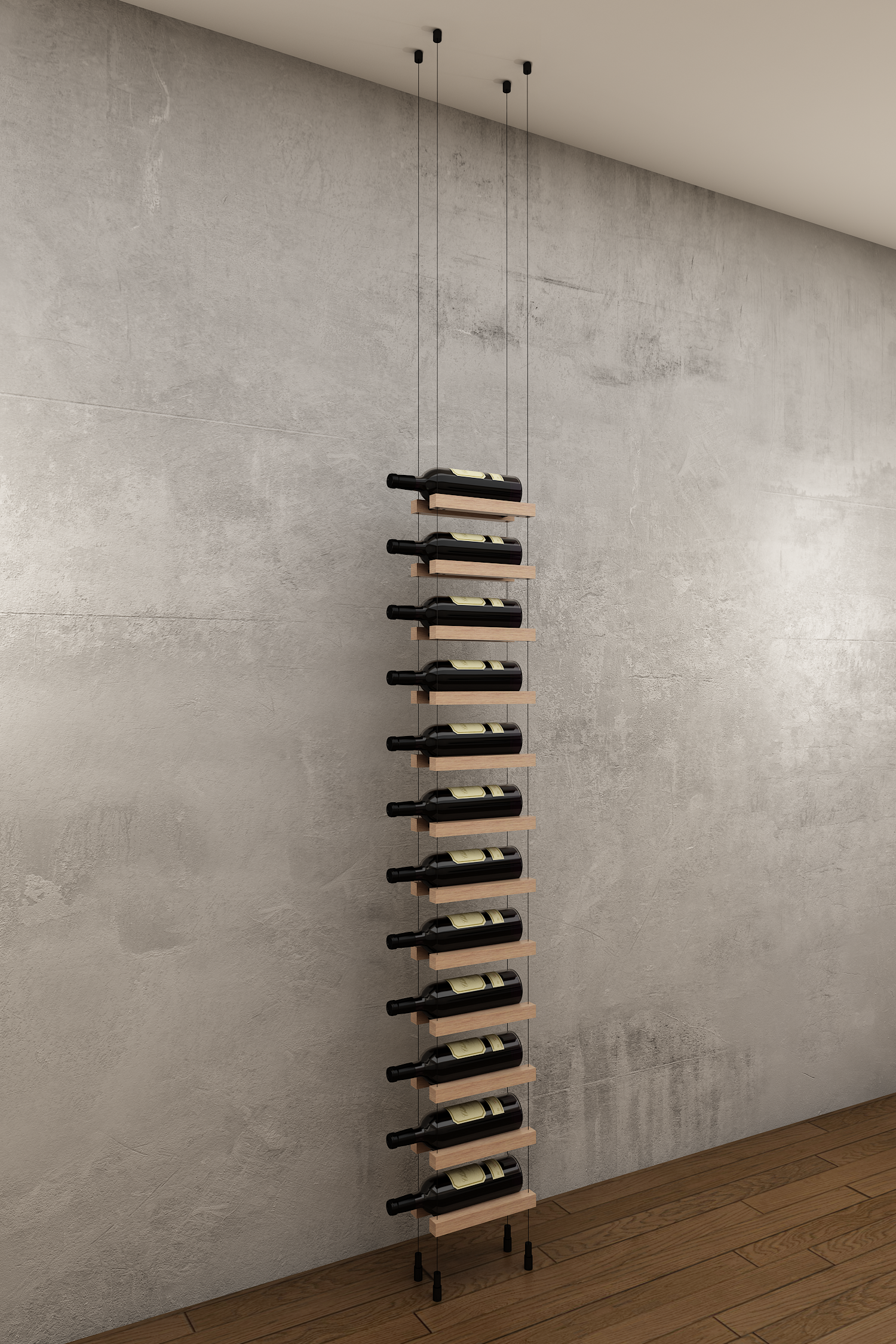 108 bottle BUOYANT® wall to floor cable wine rack with matte black frame and red oak or walnut cradles